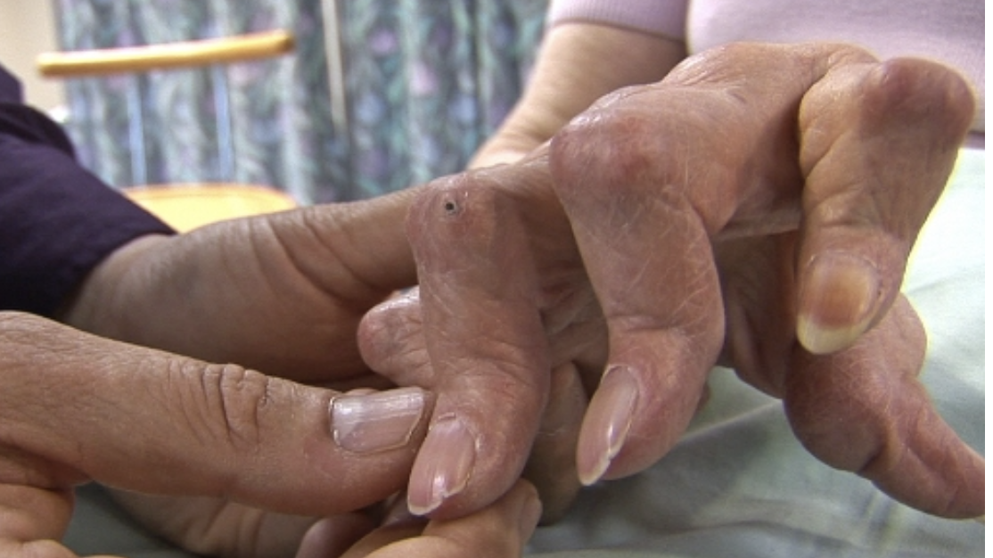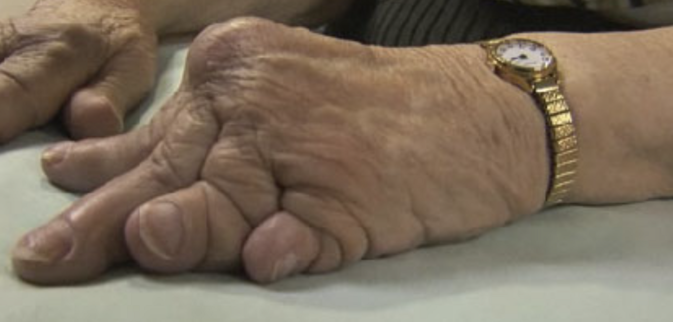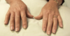 Picture illustrates: widespread digital deformity, the presence of flail digits, telescoping of the digits with redundant folds of skin in a patient with Rheumatoid arthritis (RA).