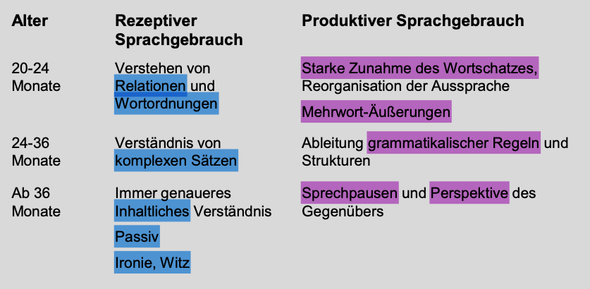 Was sind Meilensteile der Sprachlichen Entwicklung zwischen 20-36 Monaten? (Folie)