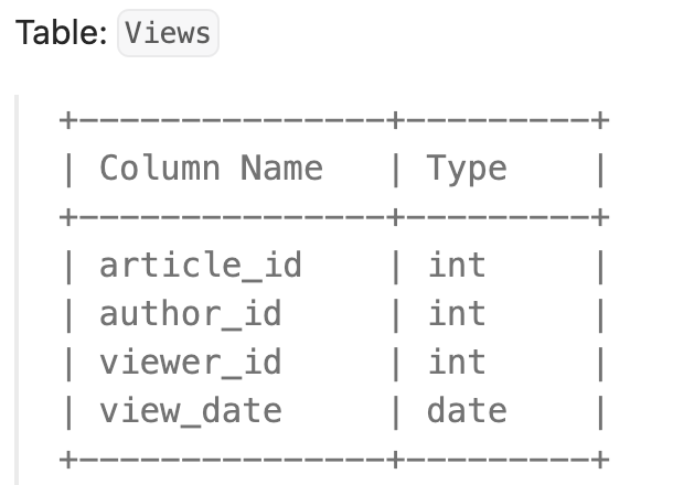 Table: Weather \+---------------+---------+ \+---------------+---------+ | id | int | | recordDate | date | | temperature | int | \+---------------+---------+