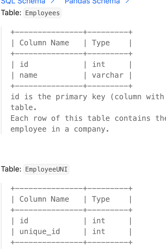 ORDER BY S.student_id, S.student_name, Su.subject_nameTable: Employee \+-------------+---------+ \+-------------+---------+ | name | varchar | | department | varchar | | managerId | int | \+-------------+---------+
