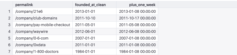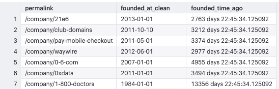 SELECT companies.permalink, companies.founded_at_clean, NOW() - companies.founded_at_clean::timestamp AS founded_time_ago FROM tutorial.crunchbase_companies_clean_date companies WHERE founded_at_clean IS NOT NULL