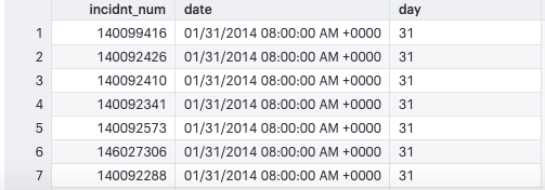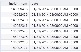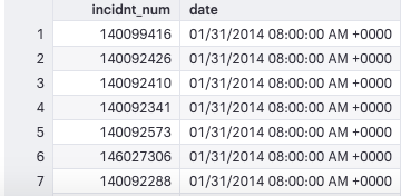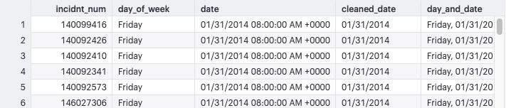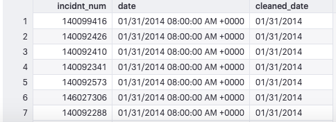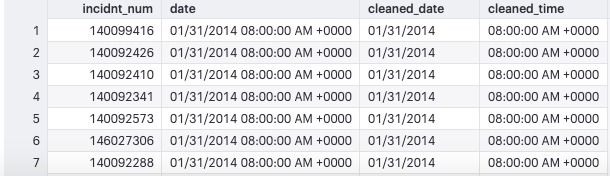 SELECT incidnt_num, date, LEFT(date, 10) AS cleaned_date, RIGHT(date, LENGTH(date) - 11) AS cleaned_time FROM tutorial.sf_crime_incidents_2014_01
