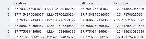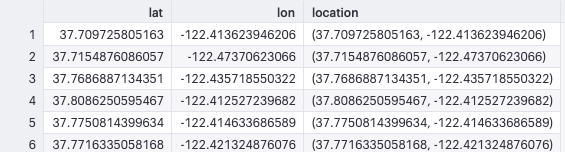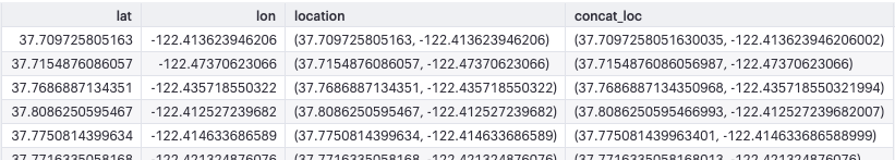 Create the same concatenated location field from lat and lon, but using the || syntax instead of CONCAT.