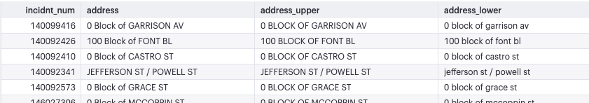 SELECT incidnt_num, address, UPPER(address) AS address_upper, LOWER(address) AS address_lower FROM tutorial.sf_crime_incidents_2014_01