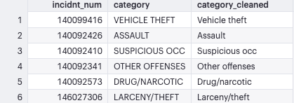 SELECT incidnt_num, category, UPPER(LEFT(category, 1)) || LOWER(RIGHT(category, LENGTH(category) - 1)) AS category_cleaned FROM tutorial.sf_crime_incidents_2014_01