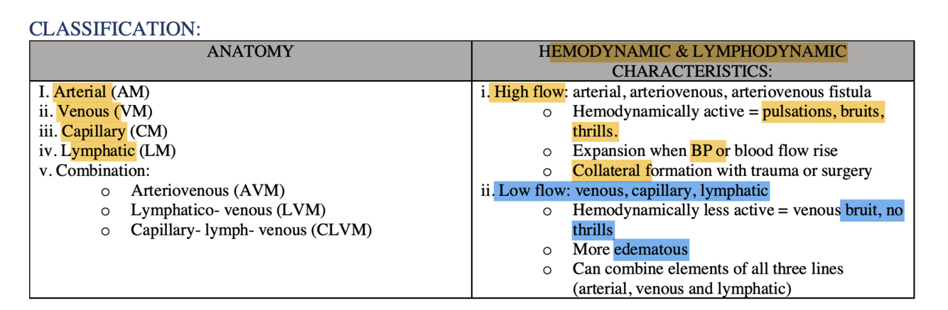 How would you classify VMs? What are the characteristics of high and low flow lesions?