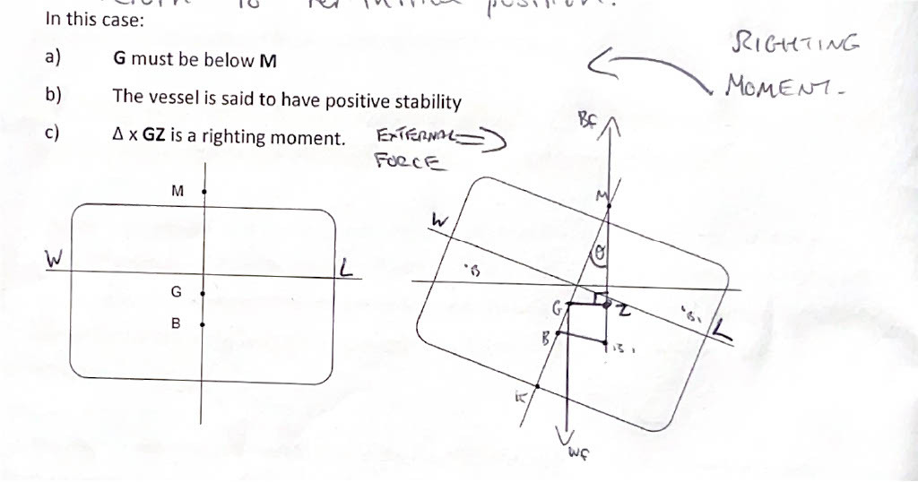 A vessel is said to be in stable equilibrium if after being inclined by some external forces she tends to return to her initial position