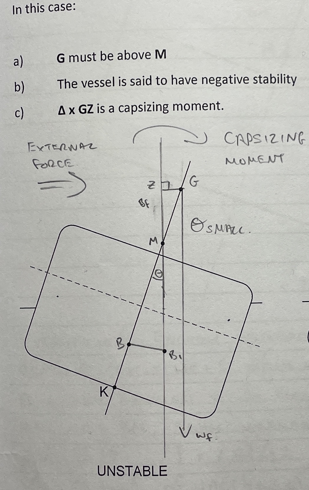 Draw a Transverse static stability diagram of a vessel in unstable equilibrium