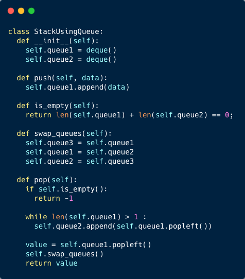 The first solution will make the ‘push’ operation faster. A good question to ask the interviewer is: what operation needs to be faster in the stack implementation? We will maintain two queues named queue1 and queue2. Let’s see what our push and pop operations look like:
