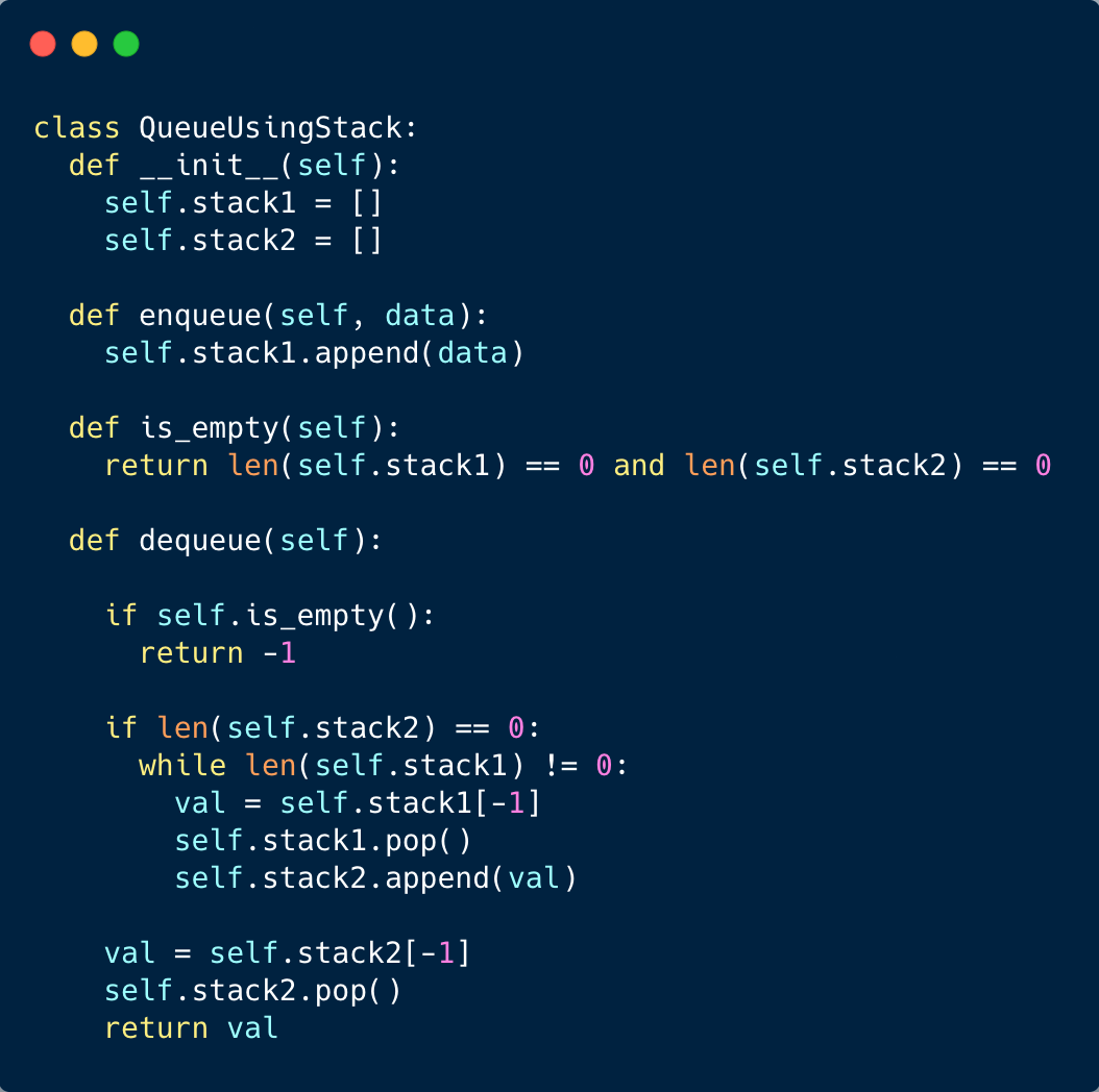 The first solution will make the ‘enqueue’ operation faster. A good question to ask the interviewer is: what operation needs to be faster on the queue implementation? We will maintain two stacks named stack1 and stack2. Let’s see what our enqueue and dequeue operations look like: