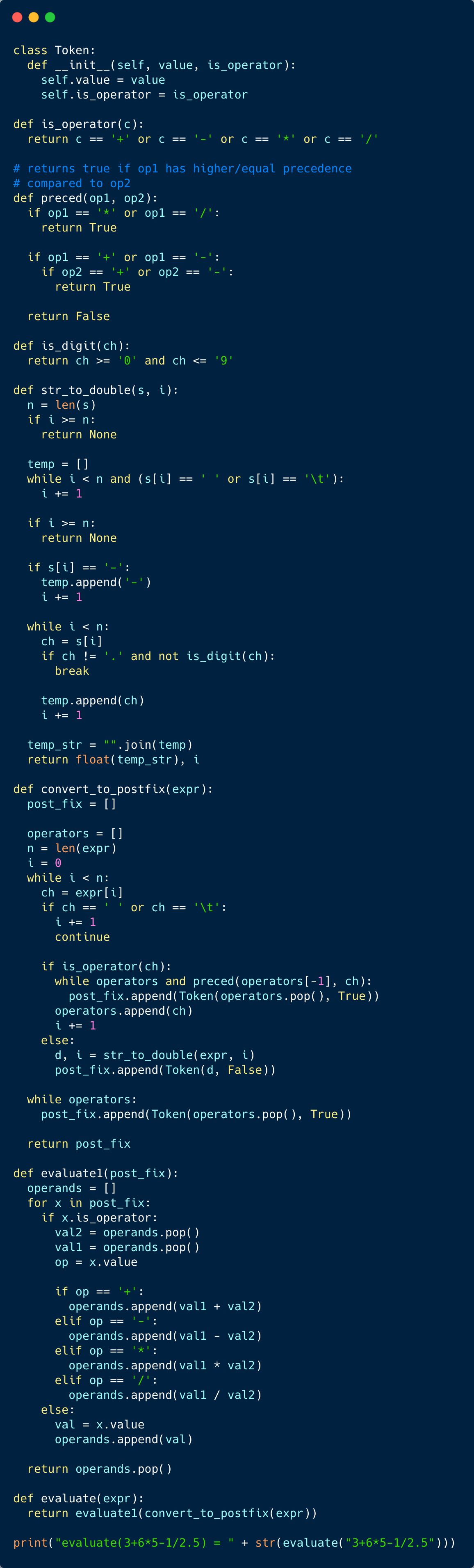 In solution 1, we’ll use the reverse polish notation to evaluate the expression. We’ll use two stacks, one for operators and one for operands. First, we’ll convert the expression into its postfix notation using an operators stack and then we’ll evaluate that postfix expression using an operands stack.