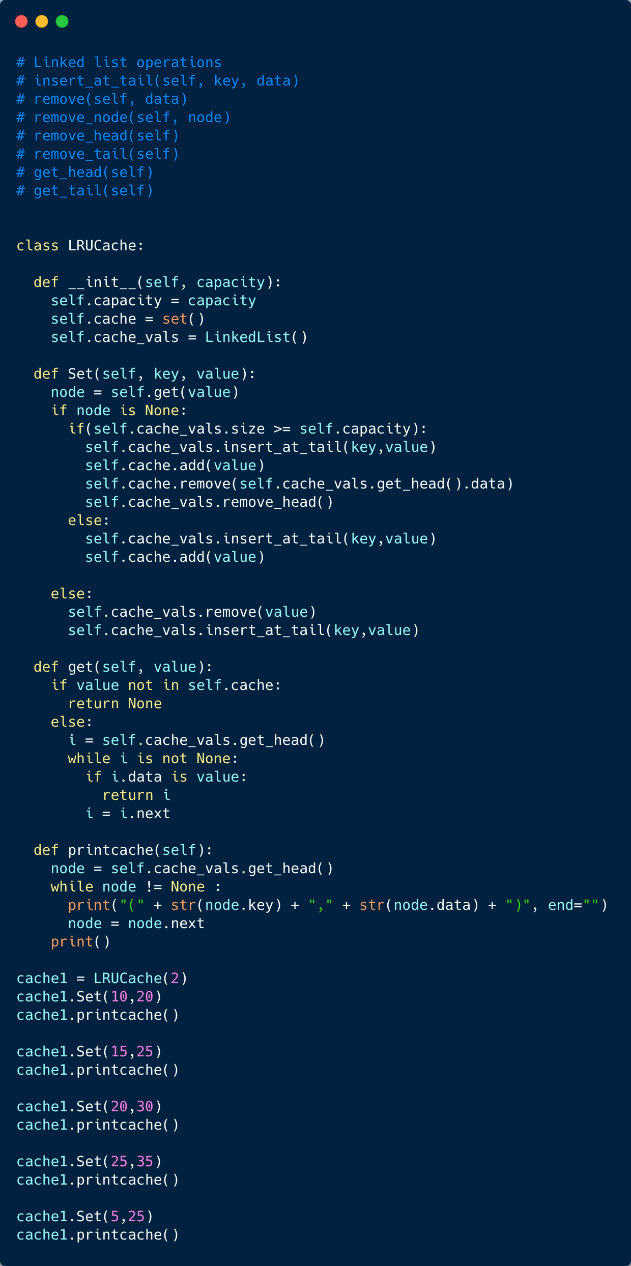 Note that the doubly linked list is used to keep track of the most recently accessed elements. The element at the tail of the doubly linked list is the most recently accessed element. All newly inserted elements (in put) go the tail of the list. Similarly, any element accessed (in get operation) goes to the tail of the list.