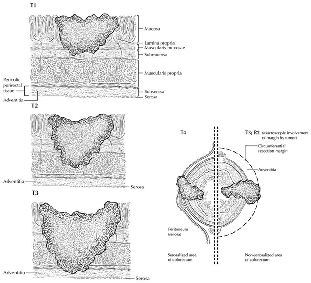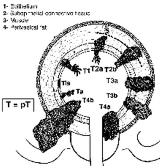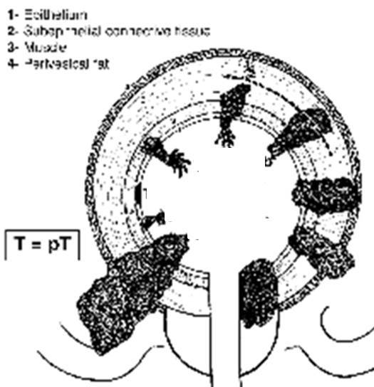 Note: There is no pathologic T1 classification. Subdivision of pT2 disease is problematic and has not proven to be of prognostic significance.