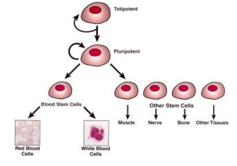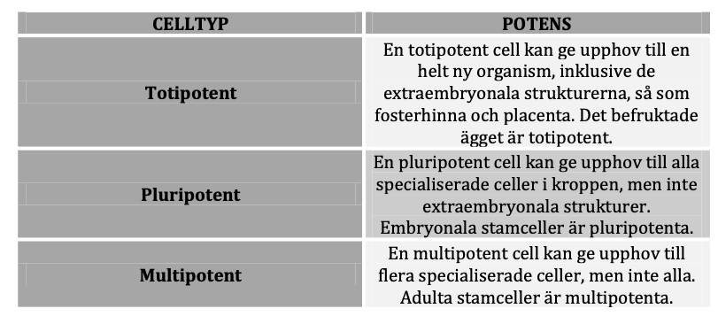 Stamceller har olika potens, vilket innebär att de har olika stora möjligheter att utveckla sig till specialiserade celler.