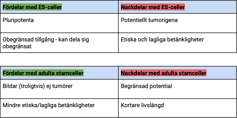 Vilka 2 för- respektive nackdelar finns det med embryonala och adulta stamceller?