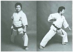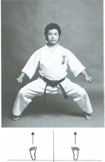 (Front view) 70% of the weight is on the back leg and 30% on the front leg. Make sure to keep your feet shoulder width apart and not directly behind each other. Hips are lowered, and you feel like you are “sitting” on your back leg. Heel of the front leg is up, enabling you to kick quickly with the front leg. Body is twisted, so as not to expose the central weak points of the body. (Side view) As illustrated, the hands in this stance are in a basic fighting position.