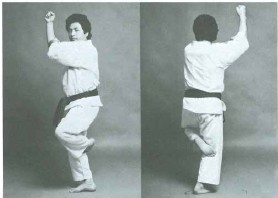 This is an advanced stance, sometimes used to execute a quick joint kick or side kick. 100% of weight is on the right leg, with the knee slightly bent, and the instep of the left foot is hooked behind the knee.