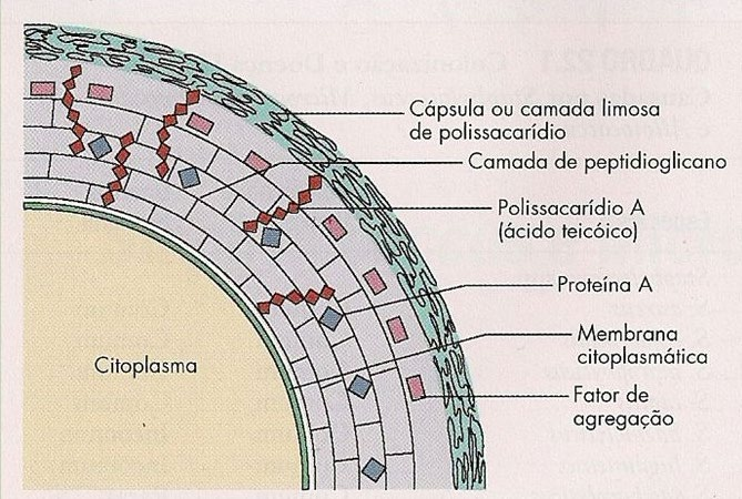 1) cápsula ou camada de polissacarídeo 2) camada de peptideoglicano ( funciona como endotoxina) 3) Polissacarídeo A (ácido teitóico, ativa resposta a antígenos) 4) Proteína A 5) Membrana citoplasmática 6) Fator de agregação