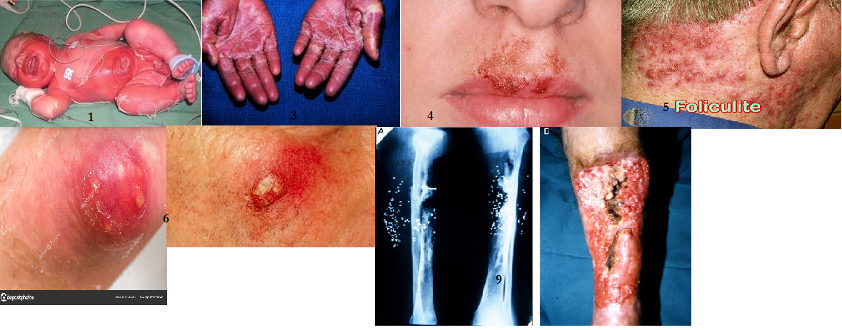 1) Síndrome da pele escaldada estafilocóccica -Aparecimento abrupto de eritema perioral localizado que se espalha para o corpo todo em 2 dias: recém nascido e criança/ IMUNOCOMPROMETIDO NÃO DEIXA CICATRIZ 2) Intoxicação alimentar -Carnes processadas, bolos recheados com creme etc: Inicio dos sintomas: 4 horas depois e duram 24 horas. Diarreia aquosa não sanguinolenta, vômitos , dor e não apresenta febre 3)Sindrome do choque toxico -Pele inteira descama, incluindo palma da mão e sola do pé 4) Impetigo -Pequena mácula – vesícula purulenta sobre base eritematosa – rompimento - crosta 5) Foliculite 6) Carbúnculos -extensão da foliculite 7)Bacteremia e endocardite 8)Pneumonia e empiema 9)Osteomielite e artrite séptica -Osteomielite decorrente de disseminação hematogênica para os ossos -Artrite pós injeções intra-articulares