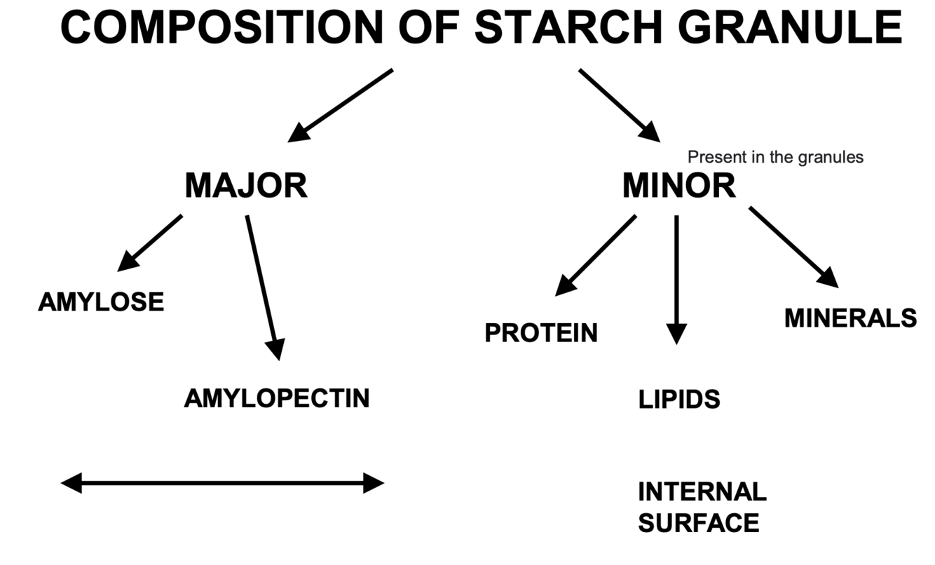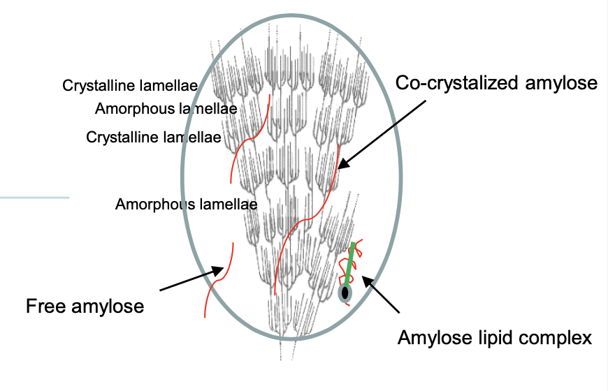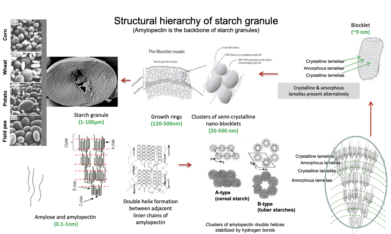 * Mainly amylopectin structure and blocklet is the base unit to form base layers of growth rings of granule. Blocklets pack themselves and then amylose runs between and through the blocks to bind them together