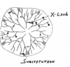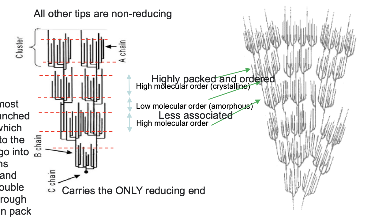 C chain is centre most chain and then branches into the B chains which extends from one to the other which then go into the smaller A chains (outermost chain). Potential to form double helical structure through H bonding. So can pack themselves where A chain is because of the linear formations through double helix formation very tightly so potential to form a highly ordered region. Branching is not linear so considered an unordered or amorphous region