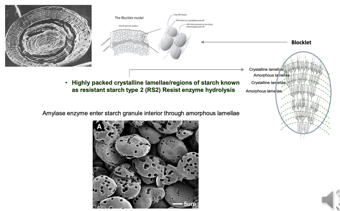 Highly packed crystalline lamellae/regions of starch known as resistant starch type 2 (RS2) Resist enzyme hydrolysis - amylase enzyme enter starch granule interior through amorphous lamellae