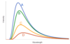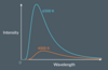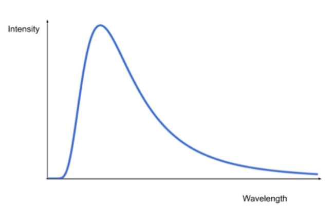 y-axis is relative intensity, x-axis is wavelength in micrometers. Visible range is about from 0.3 to 0.7 micrometers. Line curves up from near origin to peak wavelength then curves back down not as steep and levels off.