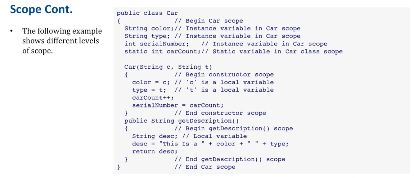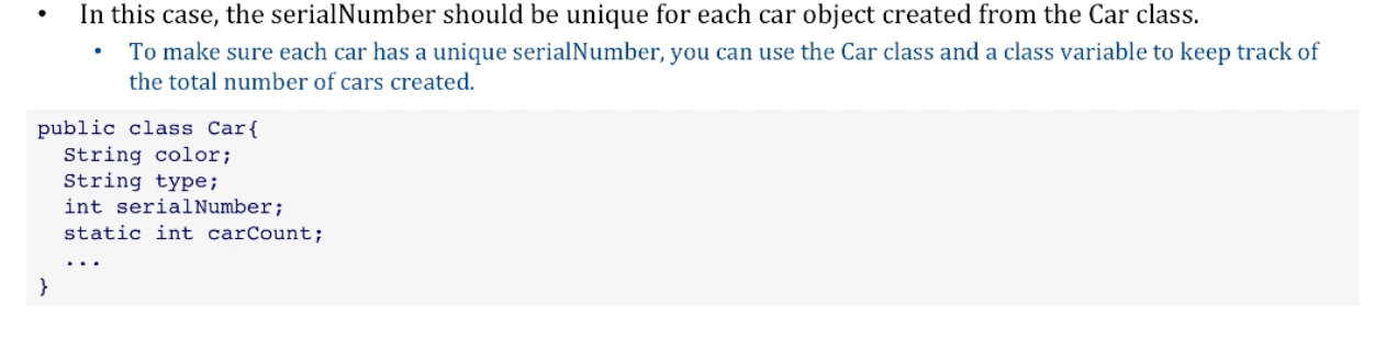 String color = "Green"; String type; int serialNumber; //Static Variable declaration static int carCount; } ~~~