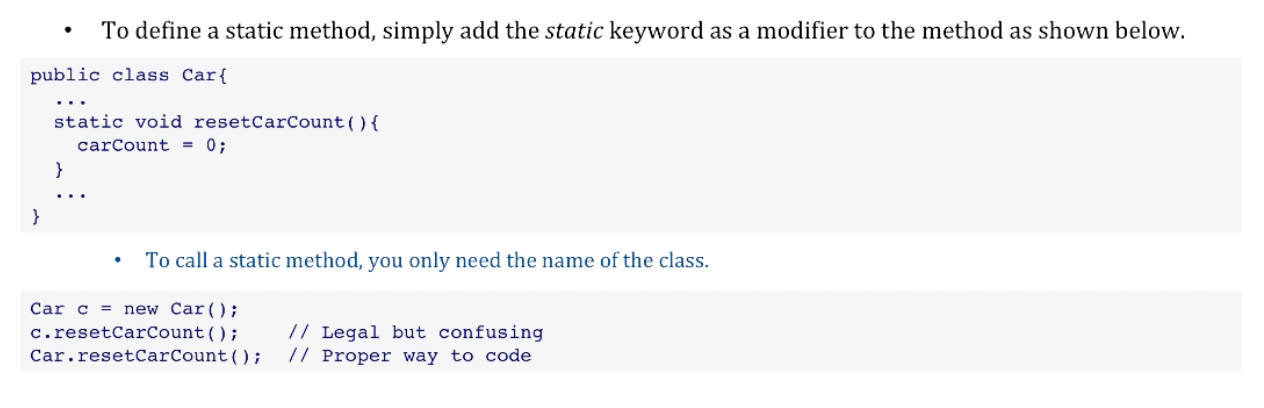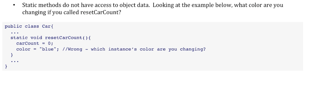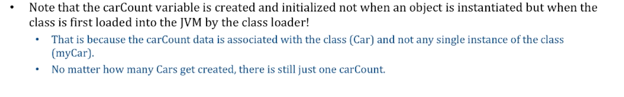 Note: As in the below notes we said carCount will always be 1. To make this increment, there has to be more work done in constructors to achieve the goal of keeping track of the count of the Cars.