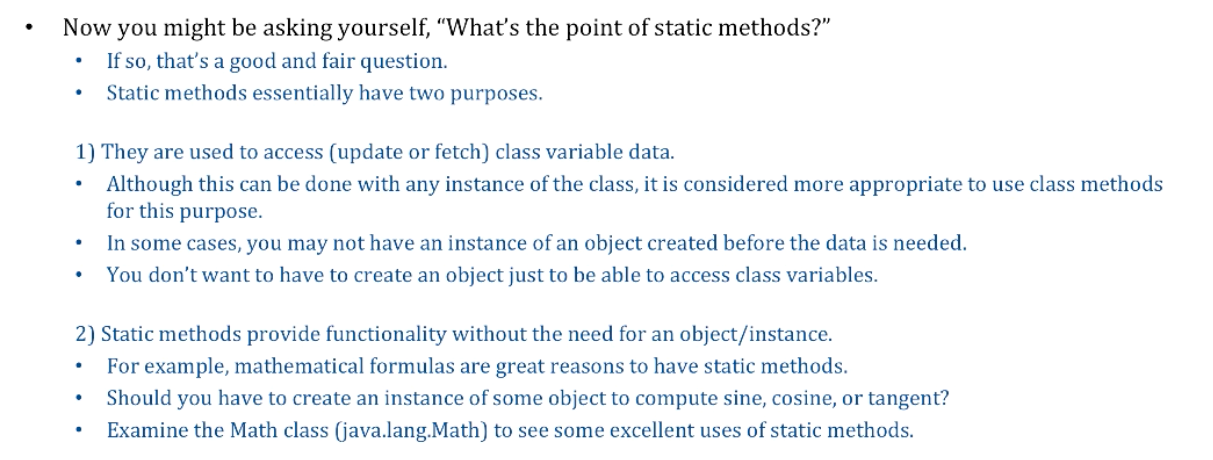 What is the point of having static methods if we cannot access instance variables or methods from it?