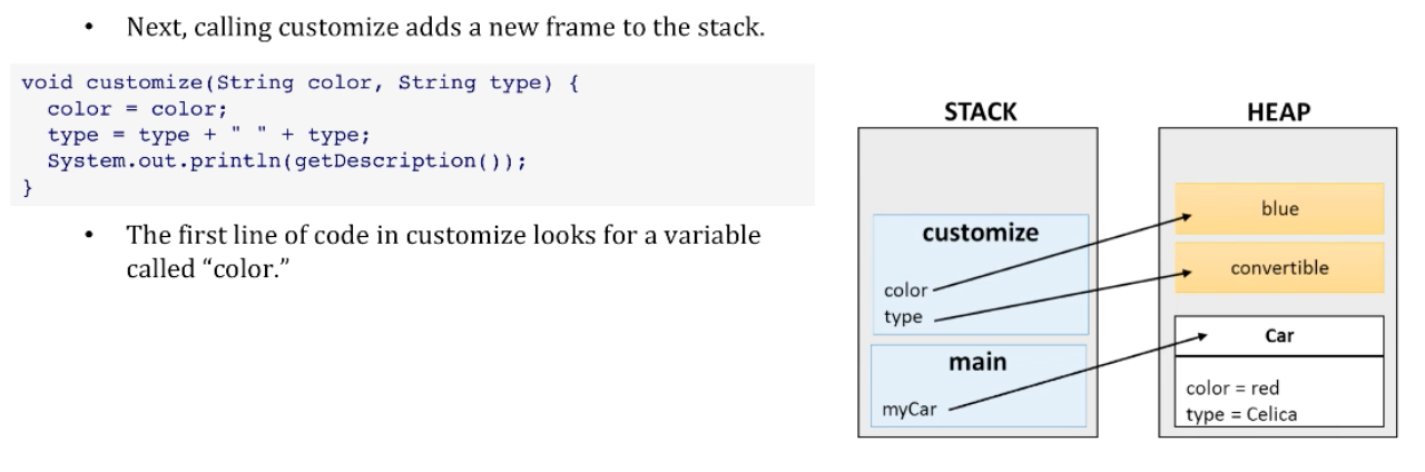 }In the picture below, let’s see how stack and heap references will be when an object myCar is created in main. We assume the initial values of color=red and type=celica. And, myCar object called customize with “blue” and “convertible”.