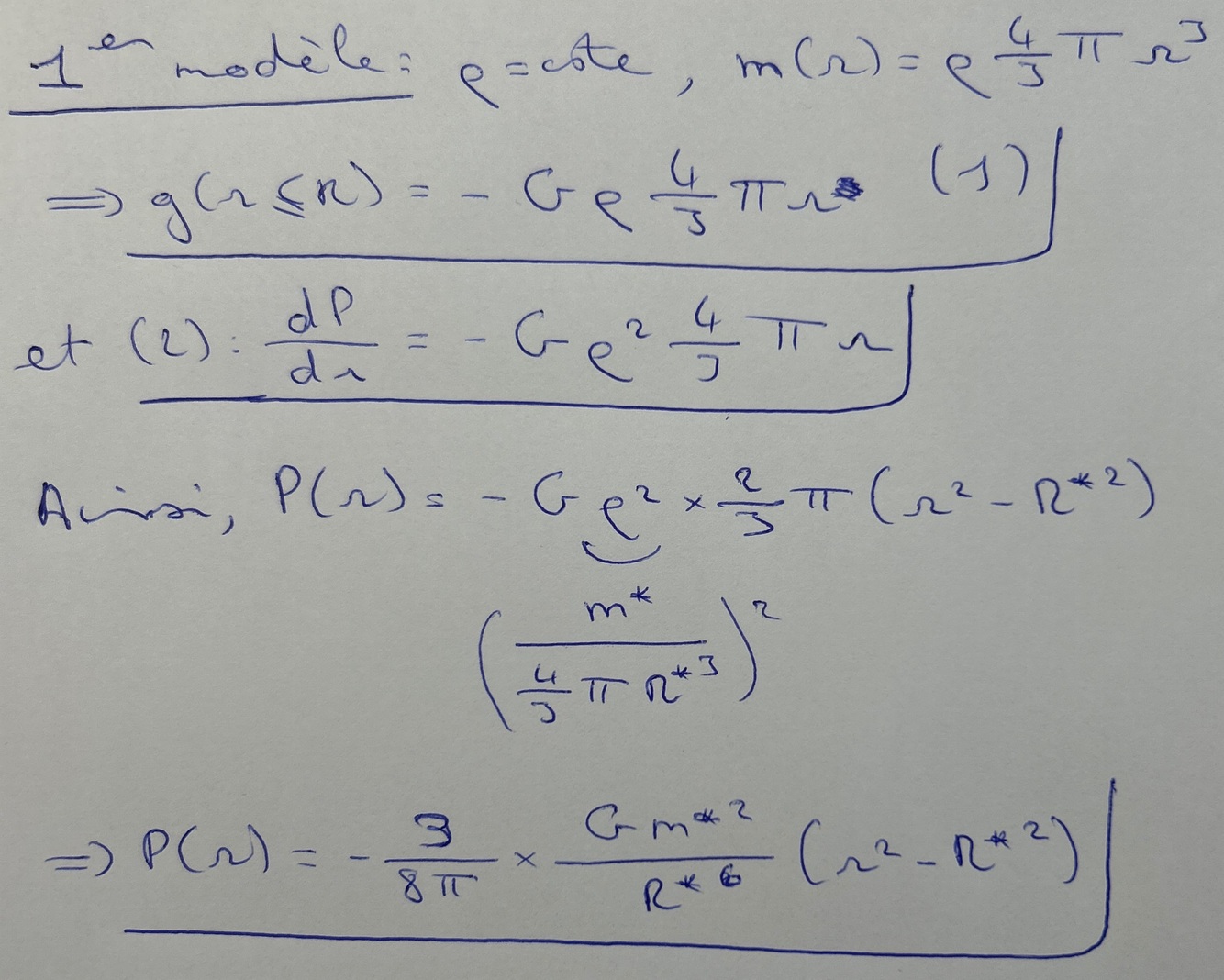 Dans un modèle ρ = cste, déterminer P(r) en fonction de r, G, m* et R*