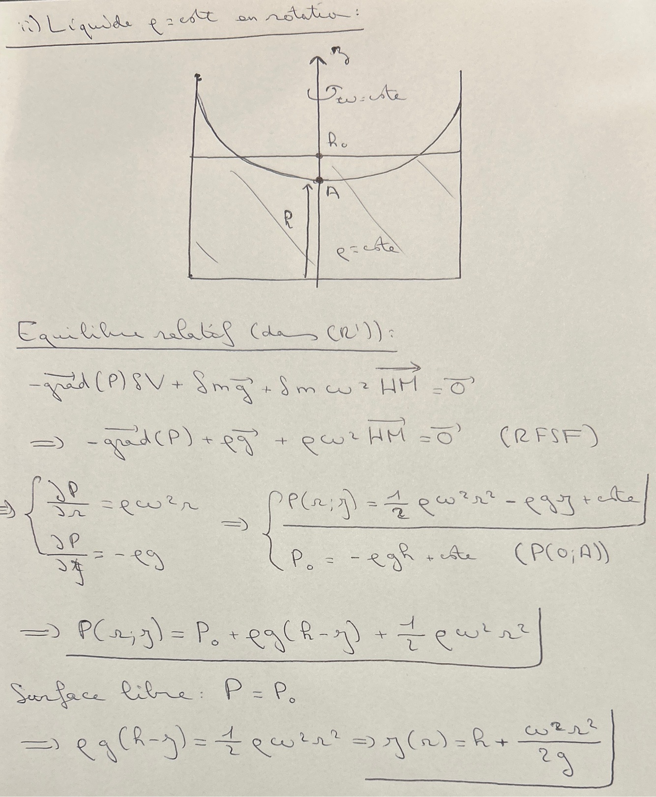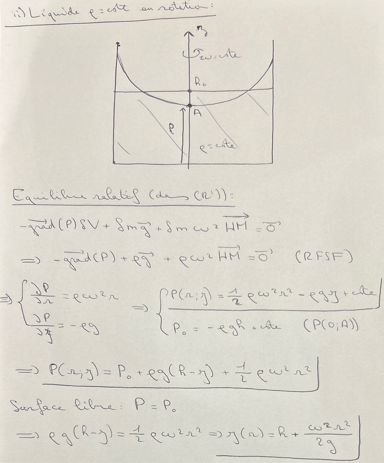 Déterminer l’équation z(r) définissant la surface du liquide à l’équilibre relatif, en fonction de ω, r, g et h = zéq(r = 0)