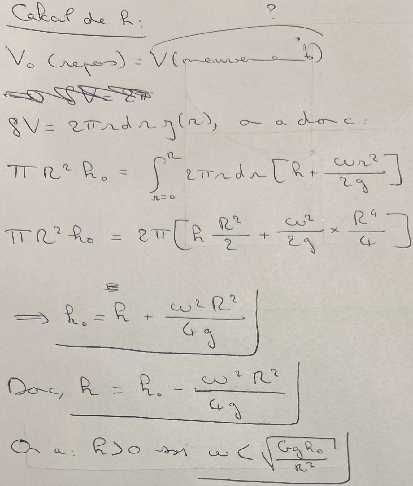 Déterminer h et en déduire pour quelles valeurs de ω il reste de l’eau au centre