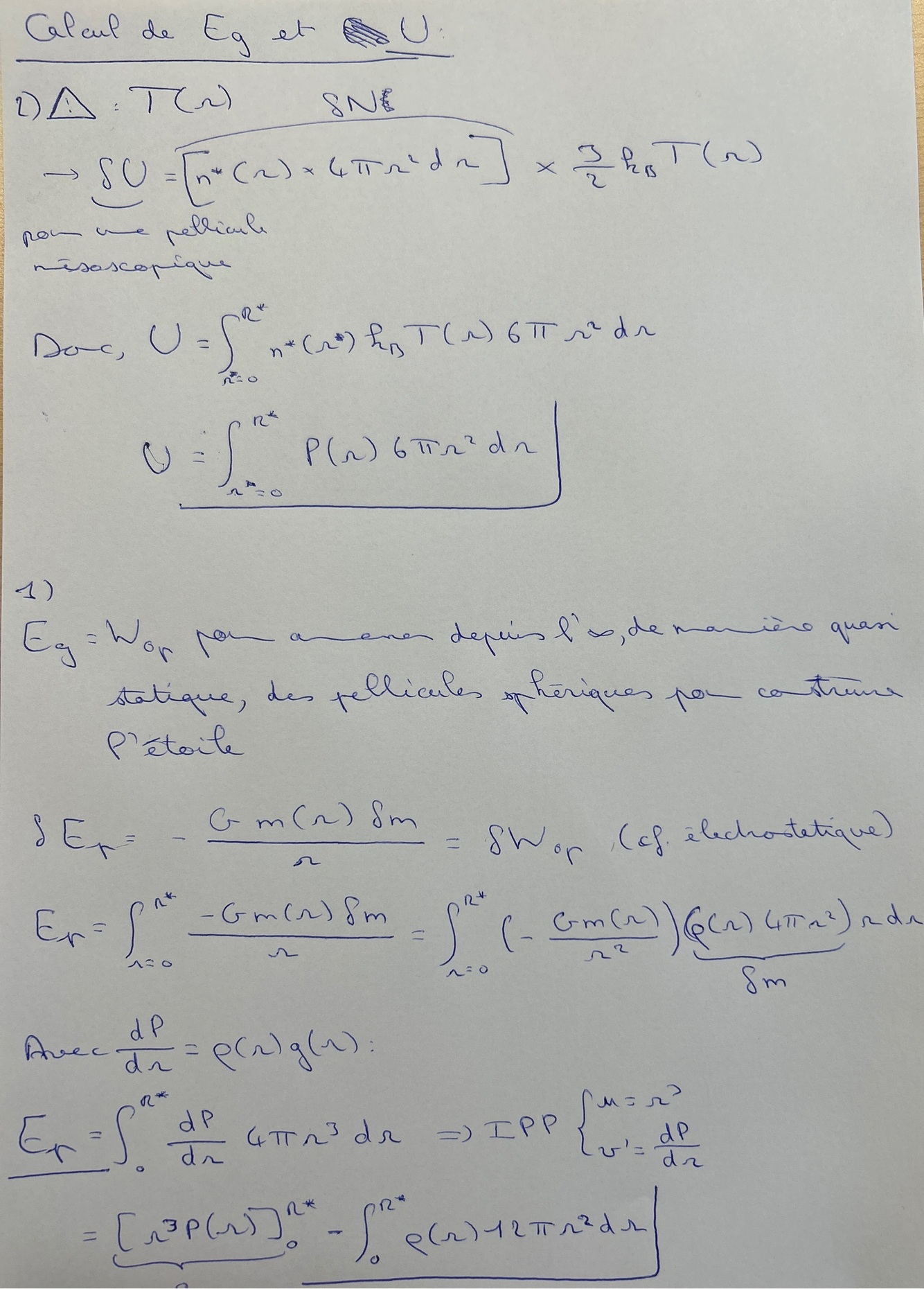 Calculer Eg (énergie potentielle gravitationnelle) et U (énergie cinétique microscopique) en supposant que le fluide est un gaz parfait monoatomique, en fonction de P(r)