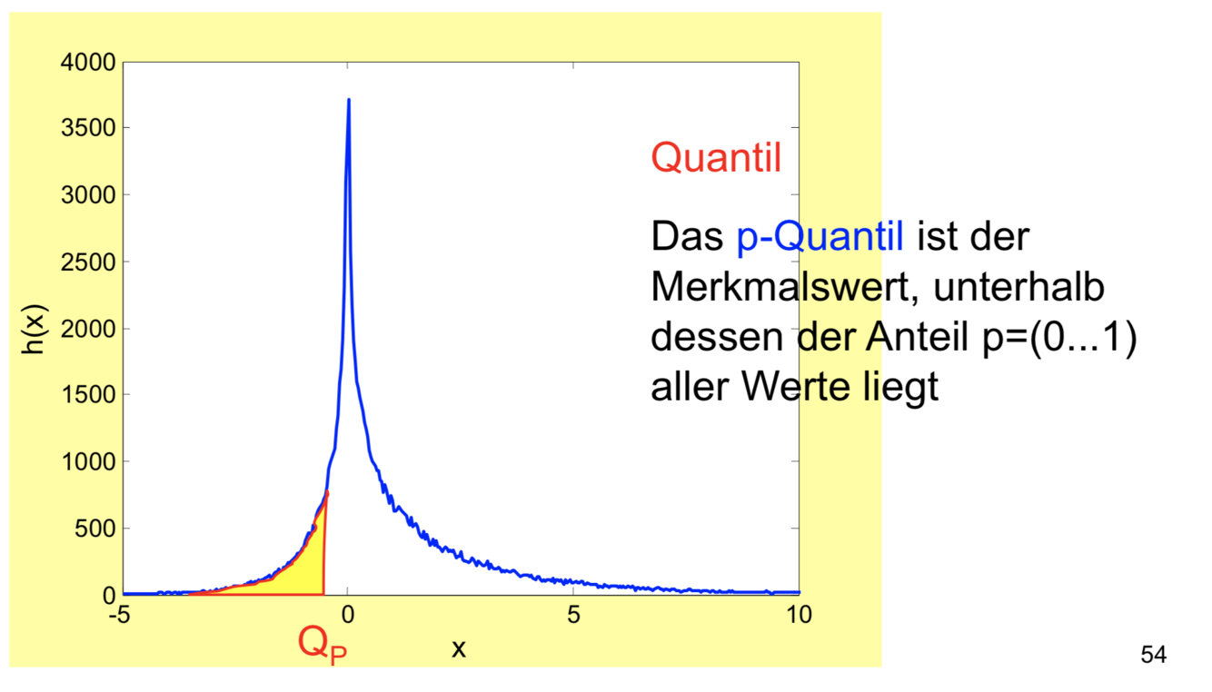 Das p-Quantil gibt an, bis zum welchen Wert von x (von links, von niedrigeren Werten her gesehen) der Anteil p von allen Daten liegt. Damit ist das Quantil zwar ein Streumaß, gleichzeitig aber auch eine Information über die Lage der empirischen Verteilung (siehe Box-Whisker-Plot). Quantile sind an sich Rangparameter, da sie Information über die Anteile (Häufung) der Daten liefern und nicht über die Ausprägung der Merkmale selbst.