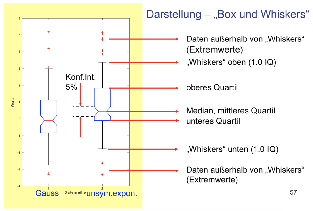 Der Boxplot ist eine sehr anschauliche Darstellung der Daten mit wenigen Parametern, die die Verteilung der Daten repräsentiert. Aus den beiden Stichproben lassen sich die wichtigsten Eigenschaften ermitteln. Währen die linke Verteilung symmetrisch ist (Gaussdaten), zeigt die rechte Spalte eine deutliche Unsymmetrie. Das untere Quartil ist vom Median deutlich weniger entfernt als das obere Quartil, was auf eine Häufung der Daten im unteren Teil hindeutet. Der Einschnitt (notch) beim Median zeigt den Bereich des Medians an, in dem der Median mit 95%-Sicherheit tatsächlich liegt (sog. Konfidenzintervall, siehe Analytische Statistik). Man kann auf diese Weise mit einem Blick erkennen, ob die beiden Mediane voneinander signifikant unterschiedlich sind. Wenn sich nämlich die Einschnitte nicht überdecken, so kann man von unterschiedlichen Medianen ausgehen. In dieser Darstellung wäre die Entscheidung allerdings grenzwertig.