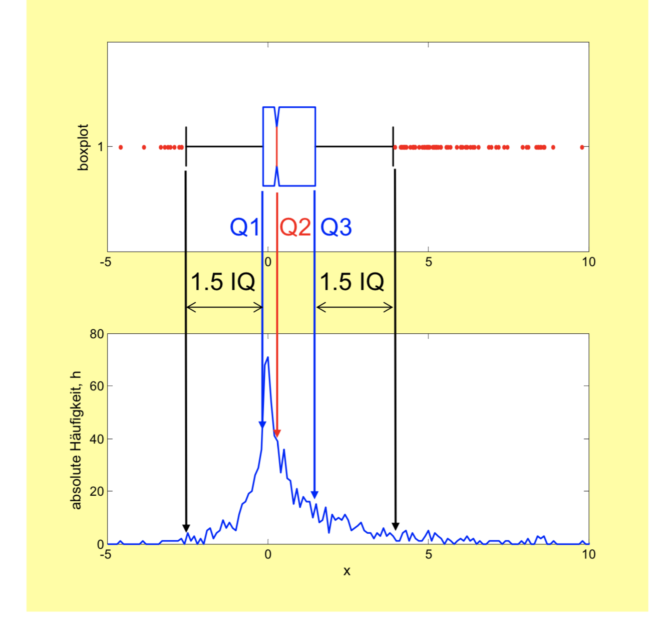 Diese Grafik soll veranschaulichen, wie effektiv die Darstellung an Hand des Boxplots ist. Während man für die empirische Verteilung (unten) u.U. sehr viele Parameter braucht (hier 100 Klassen), so reichen für den Boxplot fünf Parameter, die Quartile. Allerdings gibt der Boxplot keine Auskunft über den Modus und den Mittelwert.