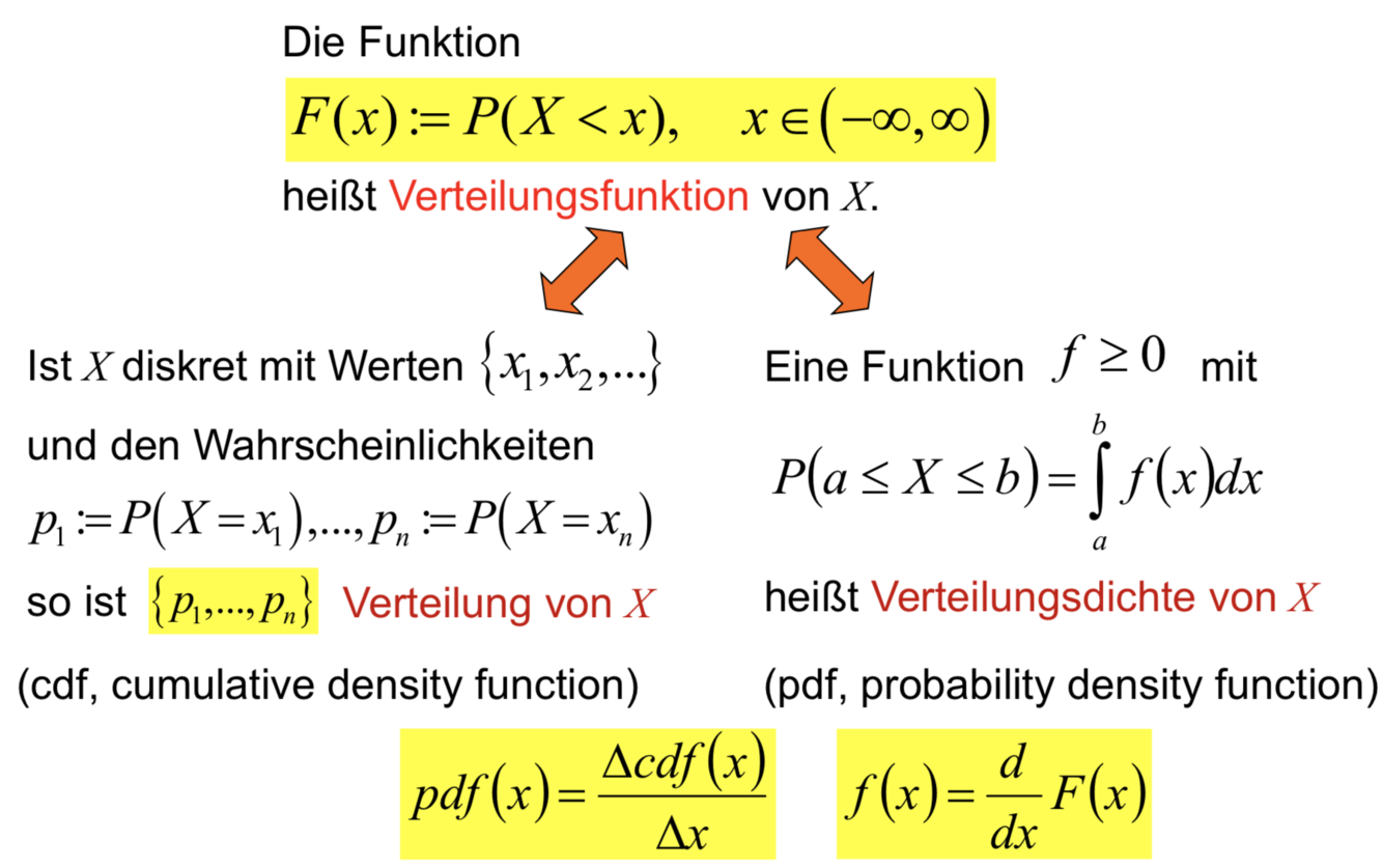 Für kontinuierliche Verteilungen gilt, dass die Verteilungsdichte sich aus der ersten Ableitung der Verteilung nach der Zufallsvariablen ergibt. Bei diskreten ZV werden die entsprechenden diskreten Zuwächse herangezogen.