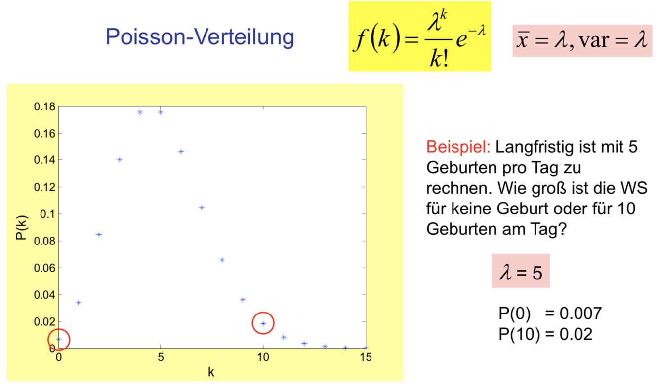 Poisson-Verteilung ist typisch für diskrete Zufallsvariable mit geringer WS des Auftretens. Für sehr hohe n setzt man für die beiden Parameter n und p in der Binomialverteilung durch deren Produkt lambda = n*p ein, so erhält man die Poisson-V.