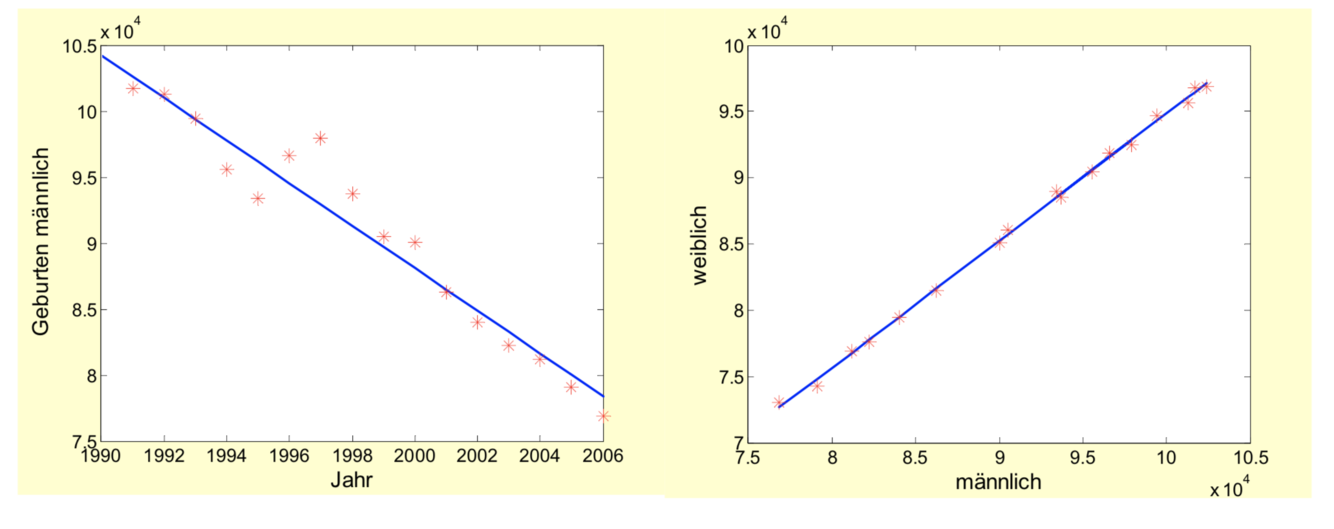 Die Geburtenzahlen in NRW seit 1990 sind als Zusammenhang zwischen männlichen und weiblichen Neugeborenen dargestellt, also ohne einen Zeitbezug. Man kann auf den ersten Blick erkennen, dass der Zusammenhang sehr stark ist, also wenig Schwankungen zwischen den Geburtenzahlen auftreten.