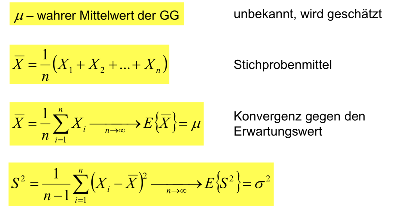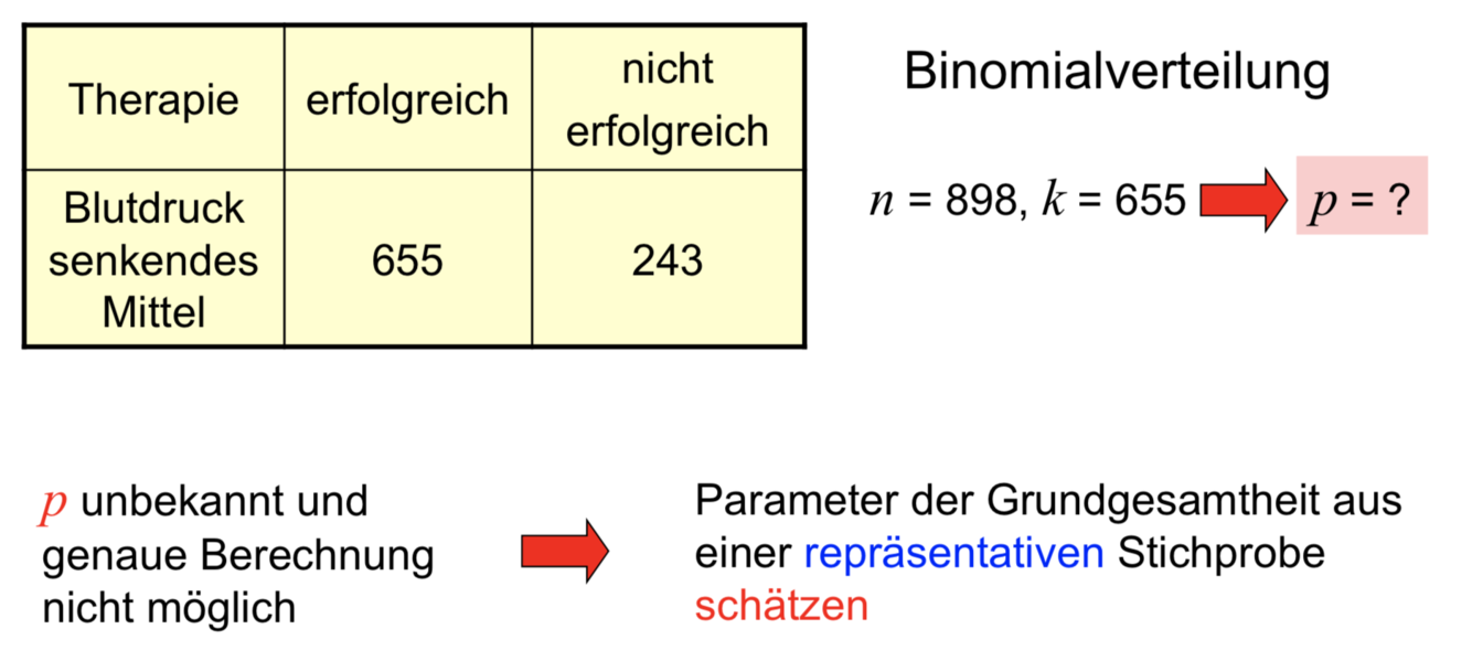 In diesem Beispiel handelt es sich offensichtlich um eine Binomialverteilung, da die ZG nur zwei Werte annehmen kann (0 – nicht erfolgreich, 1 – erfolgreich). Die theoretische Erfolgswahrscheinlichkeit ist aber nicht bekannt, sonst müssten wir die klinische Studie nicht durchführen. Sie ist auch nicht genau berechenbar, denn dazu bräuchten wir sehr viele Einzelversuche (n > 10e6), die unter identischen Voraussetzungen durchzuführen wären. Und das ist praktisch nicht realisierbar. Daher werden wir versuchen, den Erfolg an Hand einer Stichprobe (SP) aus der Grundgesamtheit (GG) zu schätzen. Damit die SP die gesuchten Parameter gut abbildet, muss sie repräsentativ sein. Praktisch heißt das, aller für die Studie relevanten Merkmale müssen in der SP anteilig so vertreten sein, wie in der GG. Und dies ist eines der größten Probleme bei der praktischen analytischen Statistik. Wenn man genau wüsste, wie die einzelnen Merkmale in der GG verteilt sind, müsste man sie nicht untersuchen. Der Ausweg besteht darin, dass man die SP nach Möglichkeit sehr groß wählt in der Hoffnung, dass die Merkmale damit rein statistisch der Originalverteilung der GG entsprechen. Aus der SP werden nach bestimmten Schätzverfahren die gesuchten Parameter der GG geschätzt. Bsp.: In einer Studie zu Blutdruck senkenden Mitteln dürfte man nicht Patienten einschließen, deren BD am oberen Ende des möglichen Bereiches liegt. Da bei diesen physiologisch ohnehin nur noch eine Absenkung möglich ist, würden sie fälschlicherweise einen Therapieerfolg demonstrieren.