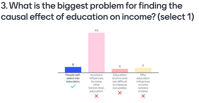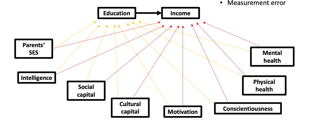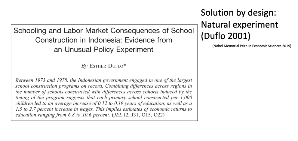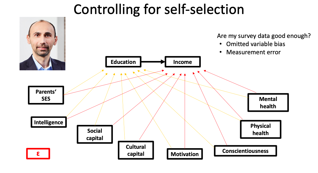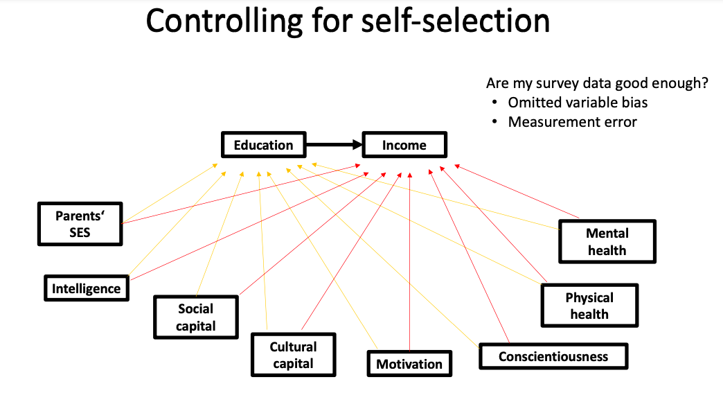 Purely observational data, I cannot just give you more education, you take it –> Why do you take it and others not? That’s the problem, you self select bc of certain characteristics