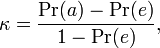 where Pr(a) is the relative observed agreement among raters, and Pr(e) is the hypothetical probability of chance agreement, using the observed data to calculate the probabilities of each observer randomly saying each category. If the raters are in complete agreement then κ = 1. If there is no agreement among the raters other than what would be expected by chance (as defined by Pr(e)), κ = 0.