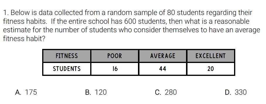 The math department at Greenview Middle School purchased new calculators last year. In Mrs. Wamble’s math classroom, these calculators are constantly breaking. She randomly selected 10 calculators and found that 3 of them were broken. If the department purchased 240 calculators, how many would you expect to be broken?