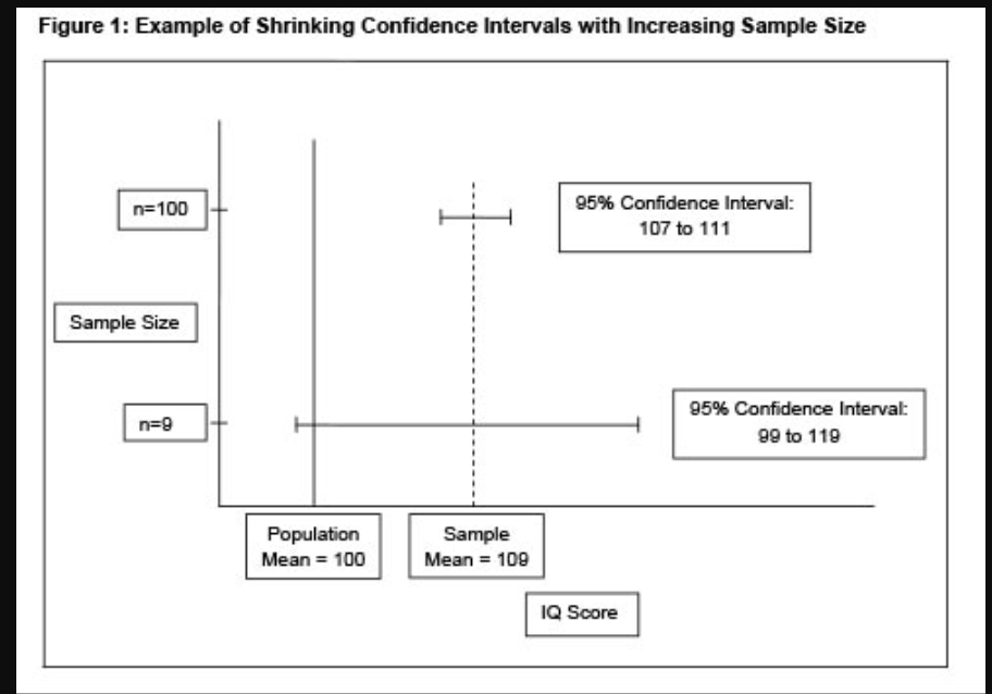 In the first scenario with n=9, the confidence interval ranged from 99 to 119 (95% CI: 99-119). Since this range contains 100, there’s no statistical difference. However, with a larger sample of 100 students, the 95% CI shrank to 107-111, indicating a significant difference from the average IQ of 100.