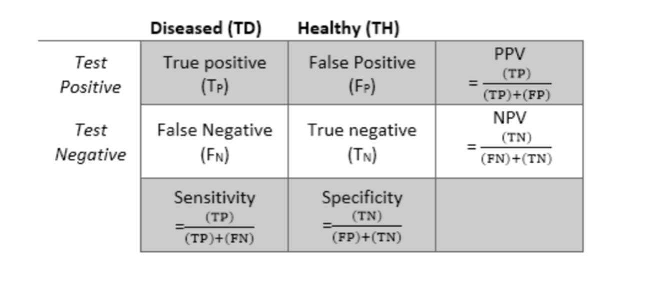 POSITIVE PREDICTIVE VALUE: proportion of people with a positive test who actually have the disease