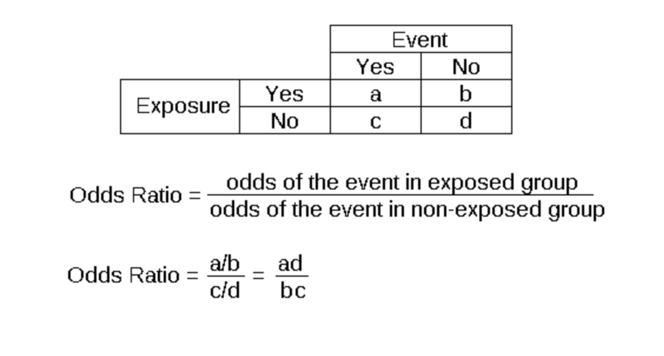 Odds Ratio: measure of association between an exposure and an outcome; how strongly an event is associated with an exposure. The larger the odds ratio, the higher odds that the event will occur with exposure.