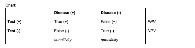 Ability to identify those with true disease; = true pos/(true pos + false neg)