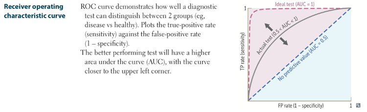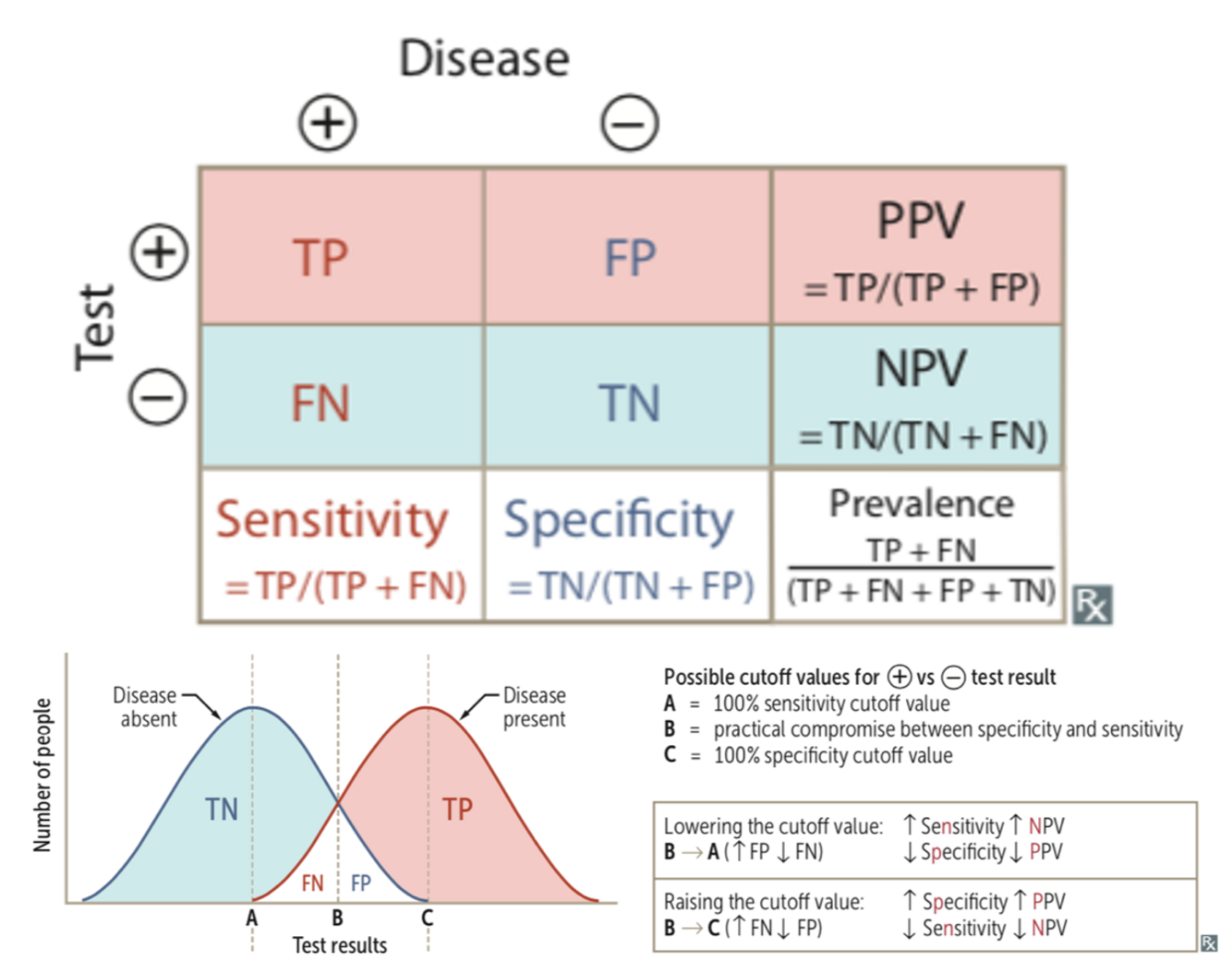 -Sensitivity (true positive rate): chance that a diseased person will test positive